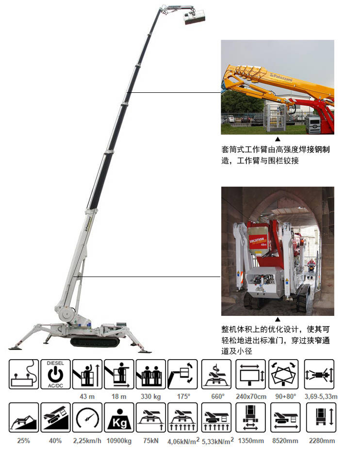 · XTJ43蜘蛛式升降机窄而紧凑,无论是驾驶和安装,它都可以在任何高度,从- 4到+ 43米,简单而直接的运动,零尾摆。